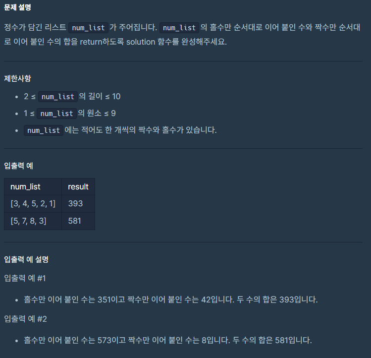- 홀수를 이어붙이고 짝수를 이어붙인 후 합을 리턴