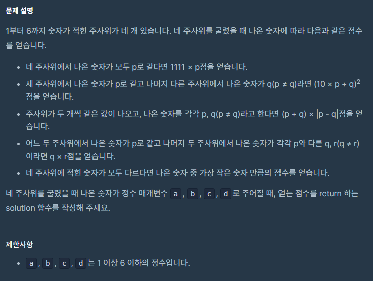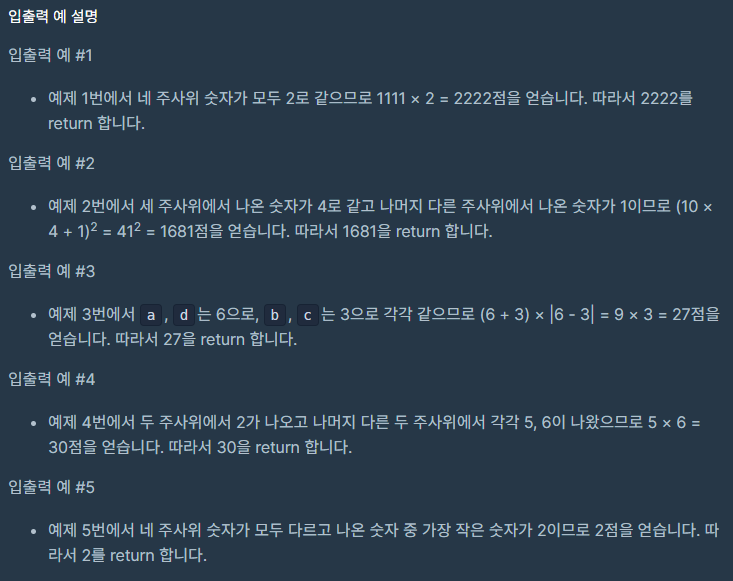 - 두개가 같고(a,b) 나머지 둘이 서로 다르다면(c, d) c * d