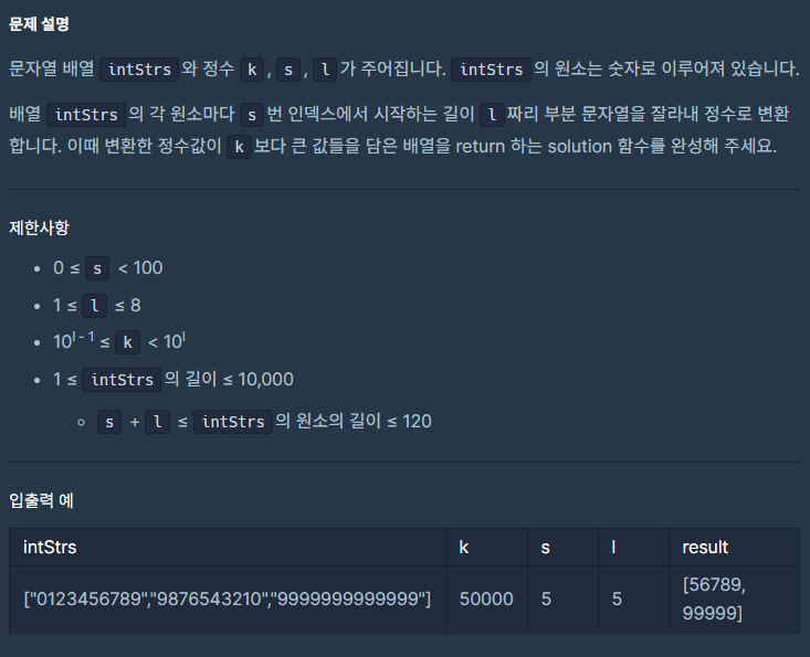public int[] solution(String[] intStrs, int k, int s, int l) {